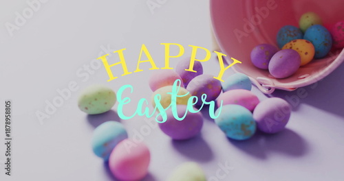 © vectorfusionart, Naklejka premium Image of happy easter text over colourful easter eggs and pink bucket on purple background