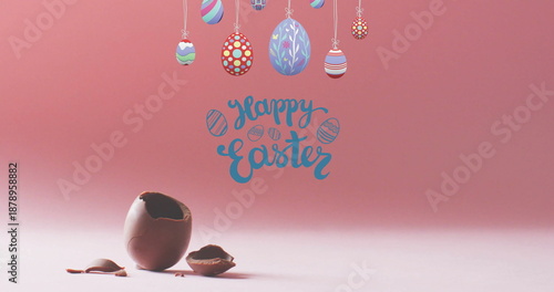 © vectorfusionart, Fototapeta premium Image of happy easter text over colourful easter eggs on pink background