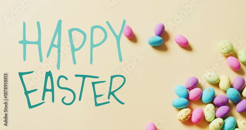 Obraz premium Image of happy easter text over colourful easter eggs on yellow background