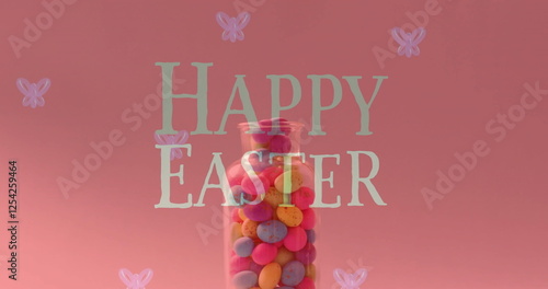 Fototapeta premium Image of happy easter text over colourful eggs in jar on pink background