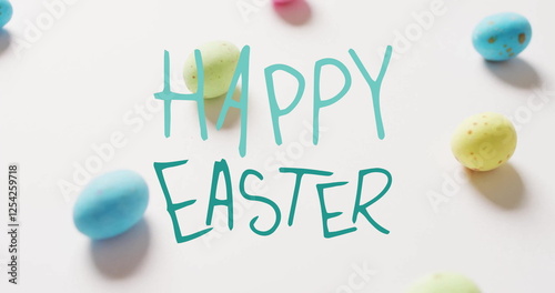 Fototapeta premium Image of happy easter text over colourful eggs on white background
