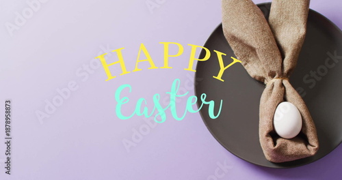 Fototapeta premium Image of happy easter text over white easter egg in cloth on purple background