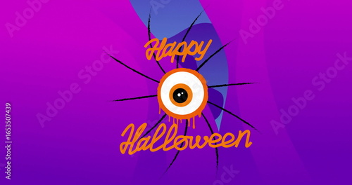 Fototapeta premium Image of happy halloween text with moving eye over purple shapes on blue background