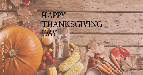 © vectorfusionart, Fototapeta premium Image of happy thanksgiving day text over autumn leaves and produce on wooden background