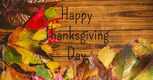 © vectorfusionart, Naklejka premium Image of happy thanksgiving day text over fall leaves