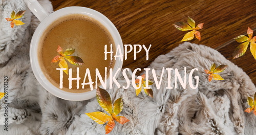 Fototapeta premium Image of happy thanksgiving text over autumn leaves and cup of coffee on...
