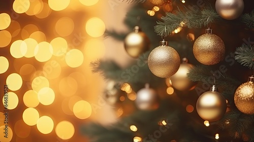 © Kartika, Fototapeta premium Image of Horizontal wallpaper close-up photo of christmas decorations on the Christmas tree
