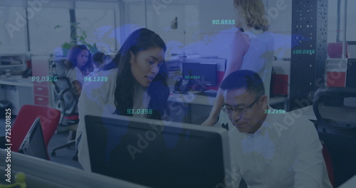 © vectorfusionart, Obraz premium Image of interface with moving numbers and information with business people working in office