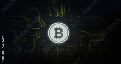 © vectorfusionart, Obraz premium Image of interference over bitcoin symbol, data processing and computer circuit board