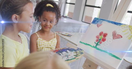 © vectorfusionart, Fototapeta premium Image of light trails over diverse schoolchildren painting