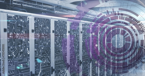 Obraz premium Image of loading circles over circuit board pattern on server racks in server room
