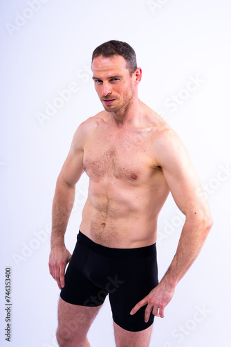 © Ivan Zelenin, Fototapeta premium Image of muscle man posing in studio, dark white red background