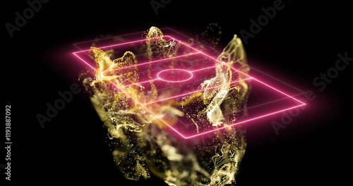 Fototapeta premium Image of network of yellow particles floating over pink neon basketball court on black