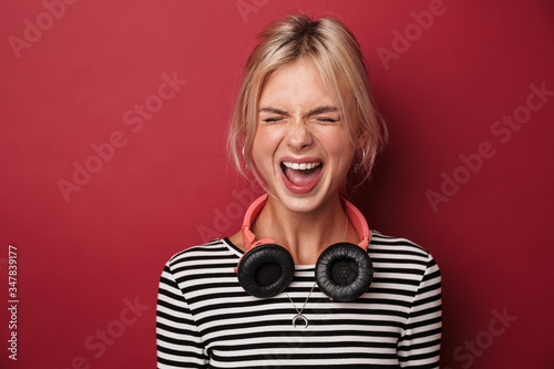 Fototapeta premium Image of nice excited woman with headphones screaming at camera
