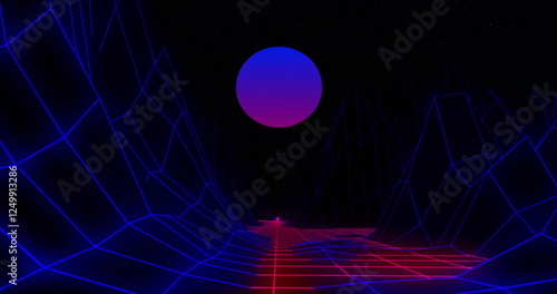 © vectorfusionart, Naklejka premium Image of pink and blue moon over moving digital grid landscape on black background