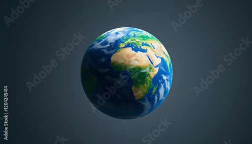 © SusDmi, Fototapeta premium Image of planet earth in blue and green spinning on grey background, blurry foreground, with white tones
