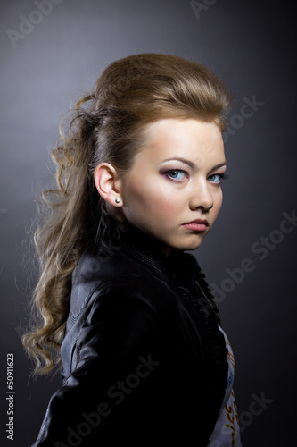 © Wisky, Fototapeta premium Image of pretty brunette posing in black jacket