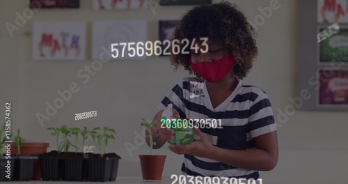 Fototapeta premium Image of rising numbers and schoolchild in class wearing face mask watering plant