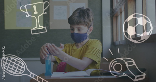 Fototapeta premium Image of school icons over schoolboy in face mask using hand sanitizer