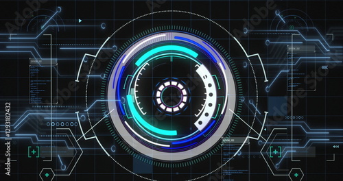 © vectorfusionart, Obraz premium Image of scope scanning and data processing over computer circuit board on black background
