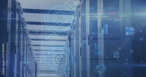 Obraz premium Image of scope scanning and data processing over tech room with computer servers