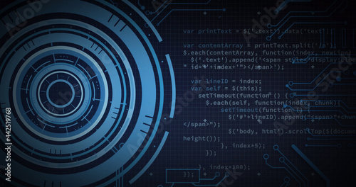 © vectorfusionart, Obraz premium Image of scope scanning, processor elements and data processing over grid