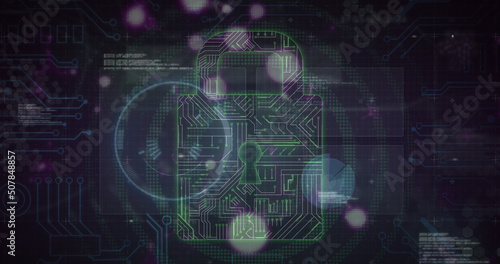 © vectorfusionart, Obraz premium Image of security padlock and data processing over navy background