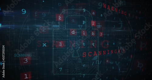 © vectorfusionart, Fototapeta premium Image of security padlock over data processing on dark background
