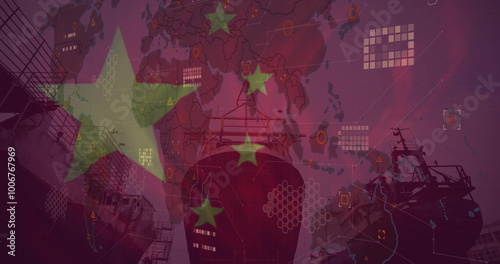 © vectorfusionart, Naklejka premium Image of ships and data processing over flag of china