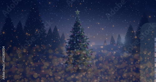© vectorfusionart, Naklejka premium Image of snow falling and light spots over christmas tree and winter landscape