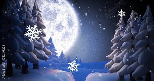 © vectorfusionart, Obraz premium Image of snow falling over full moon in winter scenery background