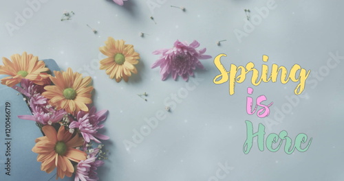 © vectorfusionart, Fototapeta premium Image of spring is here text and stars over bunch of flowers