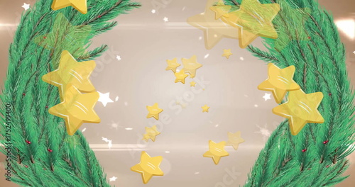 © vectorfusionart, Fototapeta premium Image of stars floating over christmas wreath