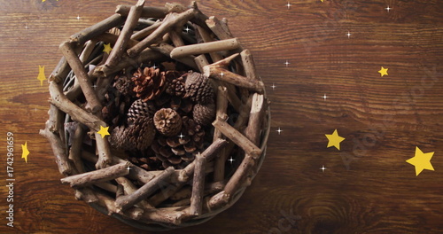 Naklejka premium Image of stars over wreath with branches and cones on wooden background