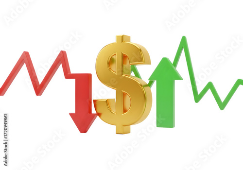 © Palash, Obraz premium Image of super premium transparent photo of golden dollar sign with red downward arrow and green upward arrow, representing financial market fluctuation, isolated on transparent background