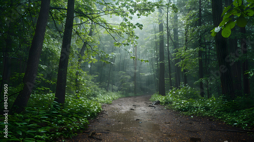 Obraz premium Image of the forest trail atmosphere with light rain falling. Create a shady...