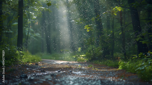 Obraz premium Image of the forest trail atmosphere with light rain falling. Create a shady...