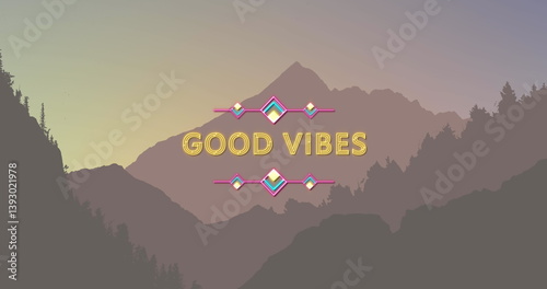 Naklejka premium Image of the words good vibes in yellow with graphic elements over forest mountains at sunset