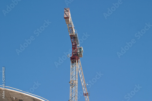 © Timofeeff, Obraz premium Image of tower crane on blue sky background