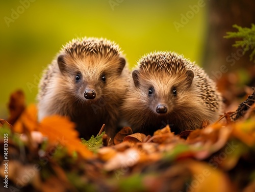 © Anup, Fototapeta premium Image of two hedgehogs nesting in a hedgehog habit in a natural forest.