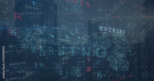 © vectorfusionart, Obraz premium Image of virus scanning and numbers over cityscape