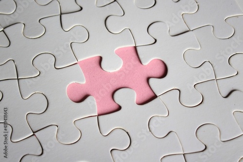 Obraz premium Image of white jigsaw puzzle with missing pieces. Incomplete, solution concept.