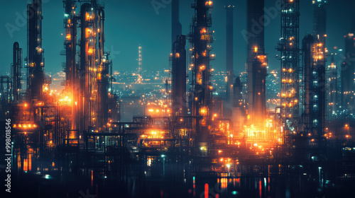 Fototapeta premium image showcases vibrant petrochemical production plant illuminated at night,...
