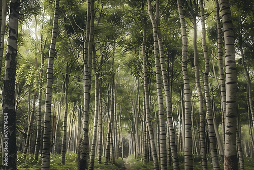Naklejka premium image showing slender trees with pale trunks and leafy triangular foliage...