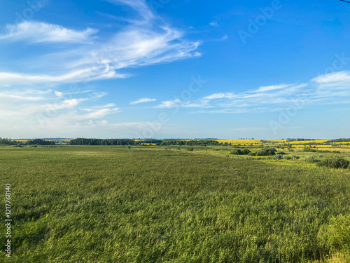 © Mister, Fototapeta premium Image shows a natural, undisturbed landscape transitioning from marshy terrain to flatlands under clear skies with scattered light clouds