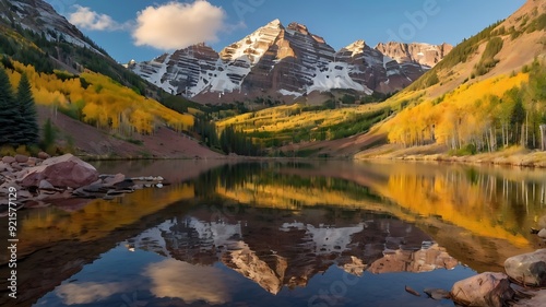 © Free, Fototapeta premium image shows a still lake with snow-capped mountains