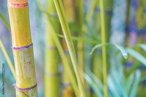 © Mister, Fototapeta premium Image shows vibrant, healthy bamboo shoots emerging from soil against a blurred backdrop of other vegetation