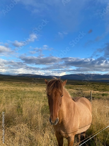 © Rebekka Hakdóttir, Fototapeta premium Image taken in Borgarfjörður, Iceland of a light brown Icelandic horse standing calmly by an electric fence in a grassy field under cloudy blue sky.