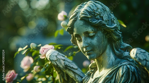 © Akash Tholiya, Fototapeta premium Image with background and place for caption and fragment of tragic sad angel statue at the cemetery. Funeral ceremony
