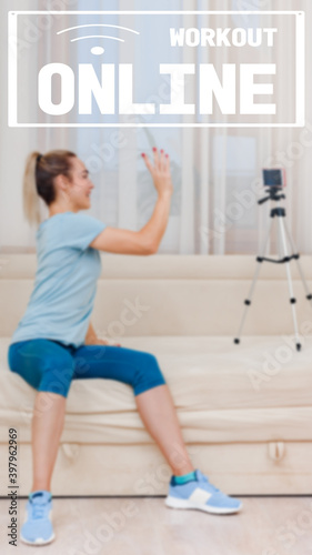 © Denys Kurbatov, Naklejka premium image with text workout online and oriented for use on a smartphone. Happy young fitness instructor talking with clients through video call, Communication through instant messengers,